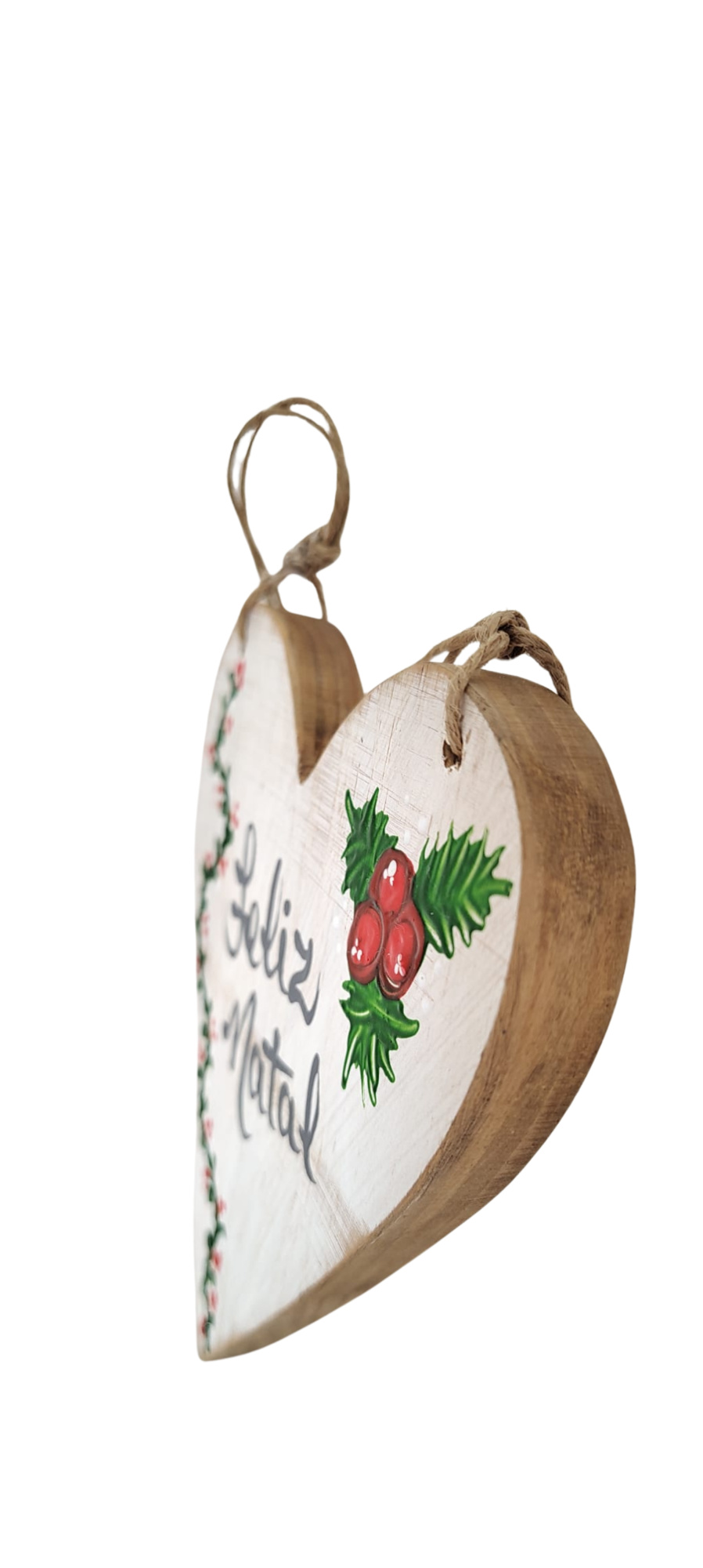 Coração De Madeira Pintado Cor Branco Pátina - Feliz Natal ( 16 x 16 x 1,5 cm )