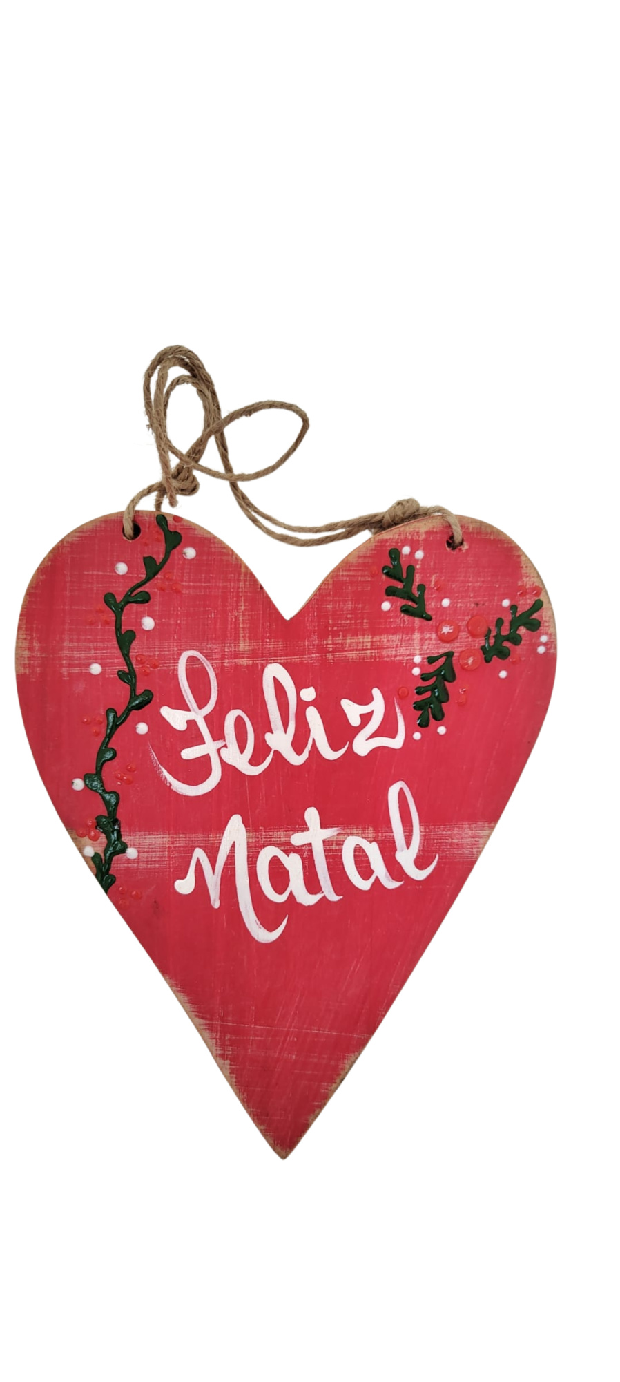 Coração De Madeira Pintado Cor Vermelha - Feliz Natal ( 16 x 16 x 1,5 cm )